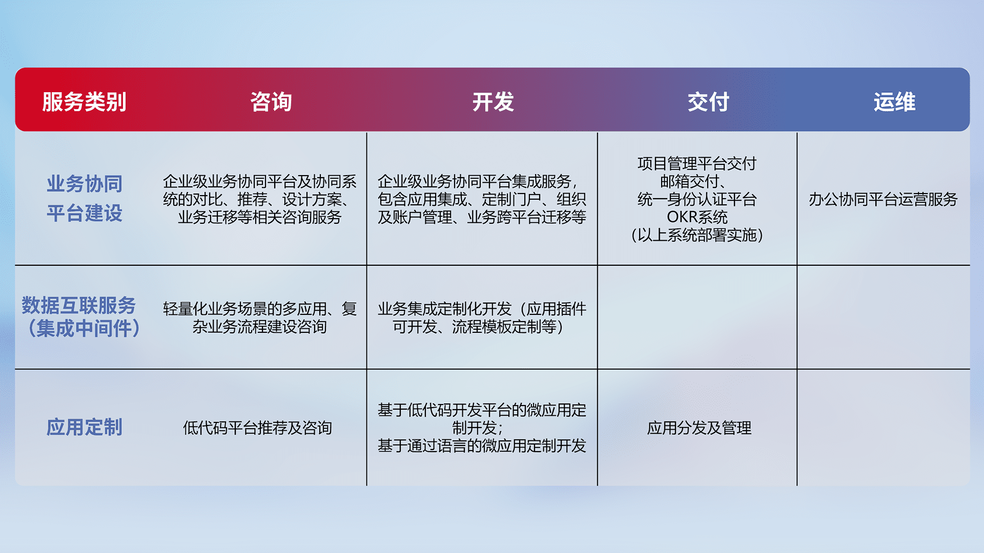 针对钉钉、、企微、、、IDaas等平台级产品提供产品的规划、、、方案、、、交付、、、、定制化开发等服务,,,,实现如统一协同办公、、、、智能客户服务、、混合会议管理、、智能数据查询、、、、等业务场景,,,实现数字化转型。。。。